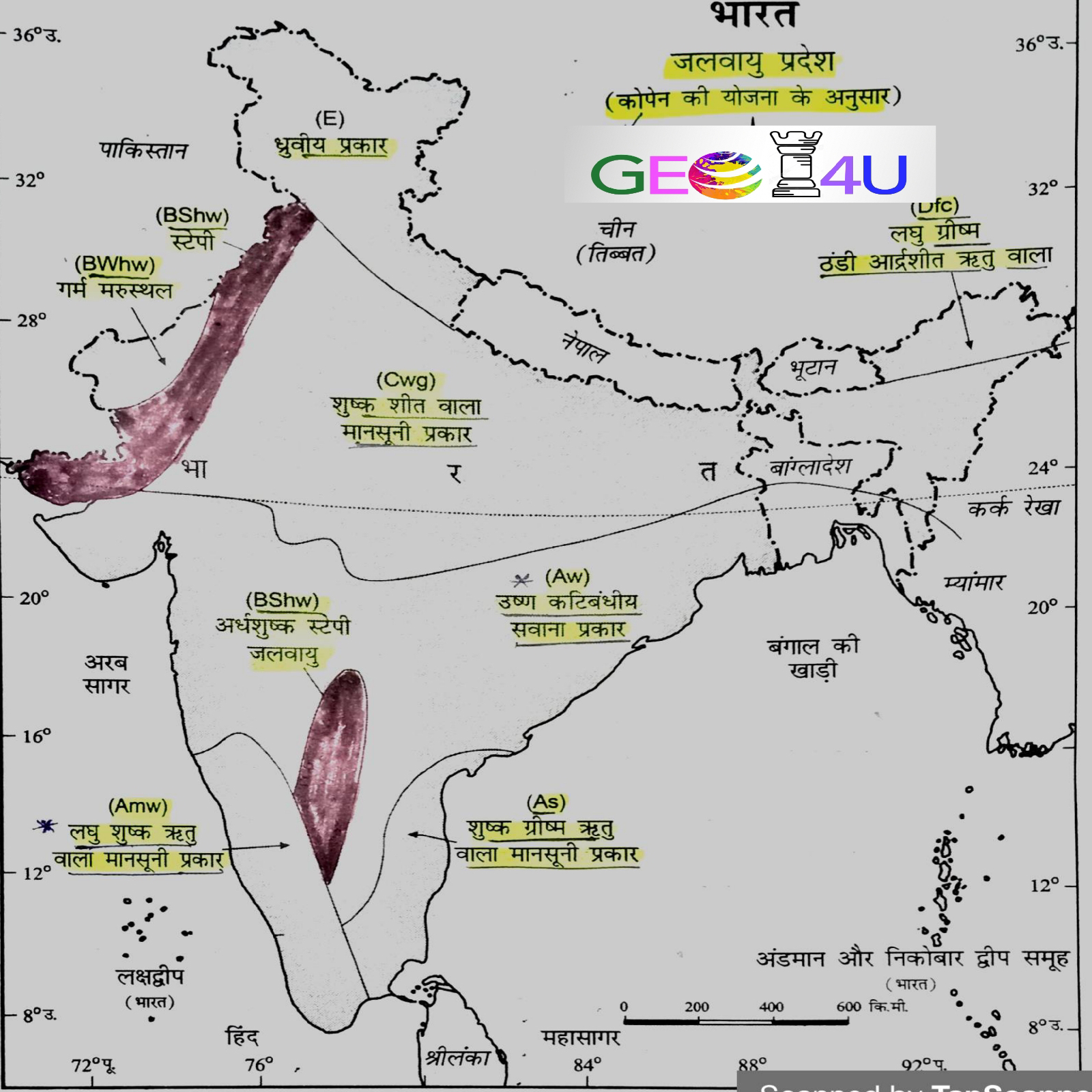 📝... कोपेन की पद्धति पर आधारित भारतीय जलवायु के प्रमुख प्रकार :- भारत की जलवायु मानसूनी जलवायु है। भारत में पायी जाने वाले मौसम के तत्वों में क्षेत्रीय विभिन्नतायें देखने को मिलती है। ये विभिन्नतायें मुख्य रूप से विभिन्न जलवायु के उप प्रकारों में प्रदर्शित होती है। एक जलवायु प्रदेश में जलवायु भी दशाओं में समरूपता पायी जाती है। जो जलवायु के कारकों के संयुक्त प्रभाव से उत्पन्न होती है। तापमान एवं वर्षा जलवायु के दो महत्वपूर्ण तत्व है। ये जलवायु वर्गीकरण की सभी पद्धतियों में मुख्य रूप से निर्णायक भूमिका निभाते है। कोपेन के जलवायु वर्गीकरण के अनुसार भारत में आठ जलवायु प्रकार पाये जाते है। ये निम्नलिखित है।